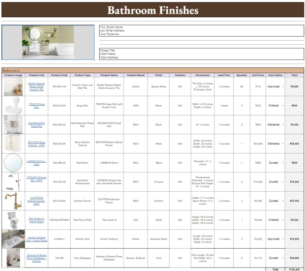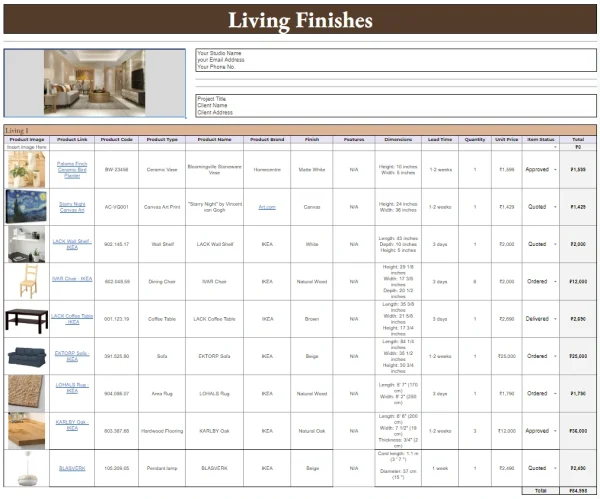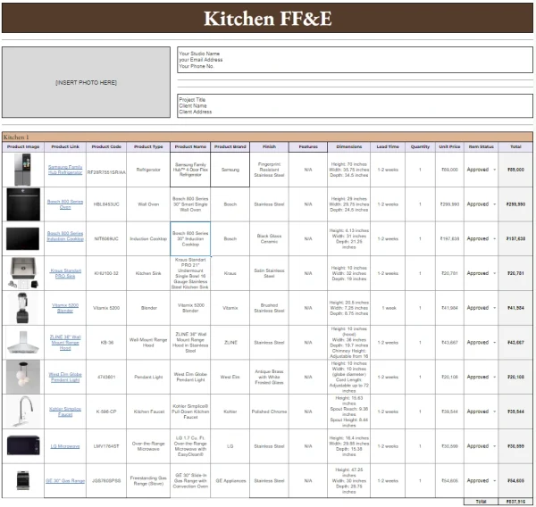 The FF&E product specification finishes schedule is a comprehensive tool designed for interior designers and architects to organize and manage all essential product information, including finishes, measurements, and specifications, in one place.