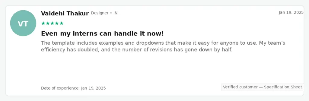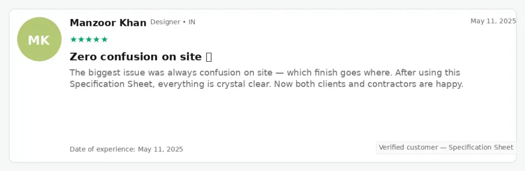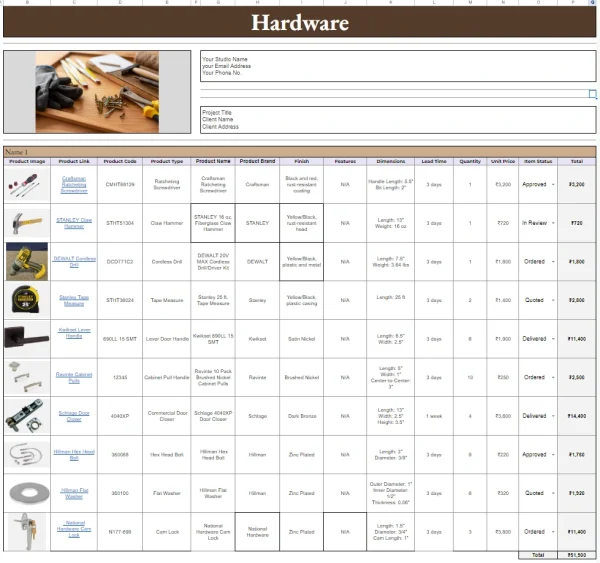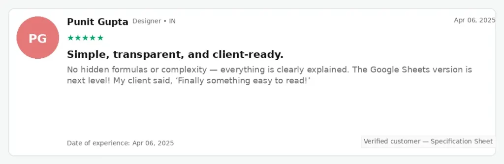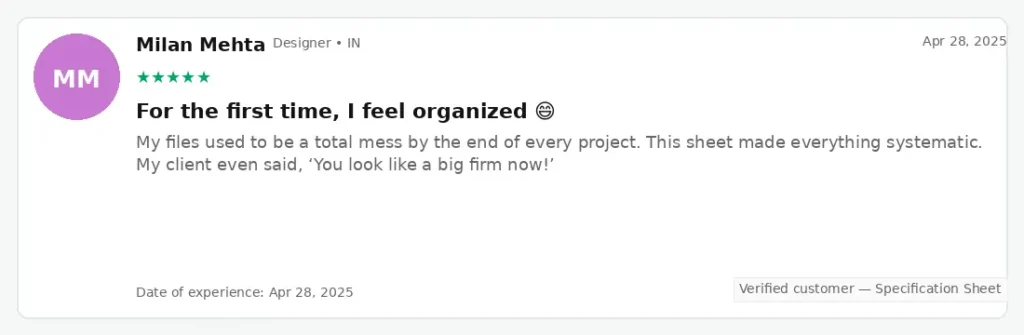 | Spreadsheet Details | ❌ Single sheet or generic templates | ✅ Two comprehensive spreadsheets with detailed specifications |